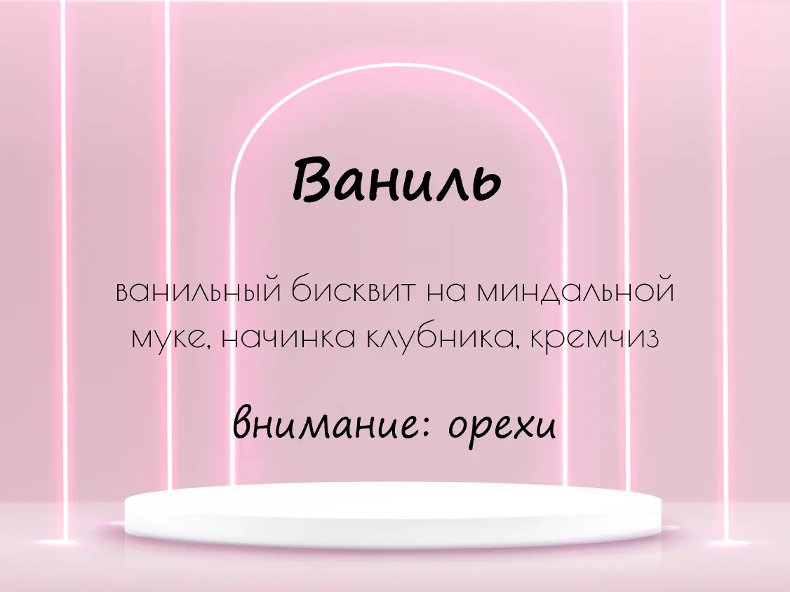Внимание: в начинке клубника-ваниль используется миндальная мука, а в начинке сникерс - арахис, в начинке морковный с вишней - грецкий орех.