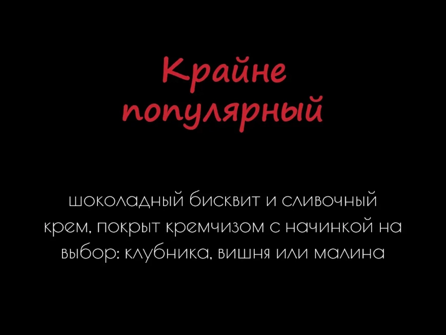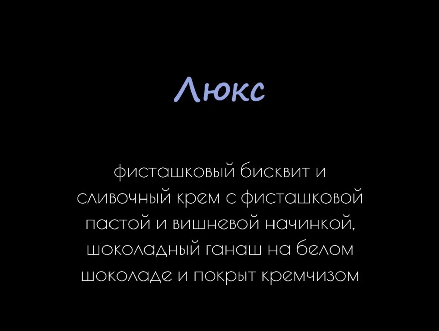 Итальянский и бельгийский шоколад, творожный сыр высших категорий, сливочное масло 82,5%, сливки 33% и многое другое в заботливых руках профессионалов создают вкусы, которые вы так полюбили или безусловно полюбите.